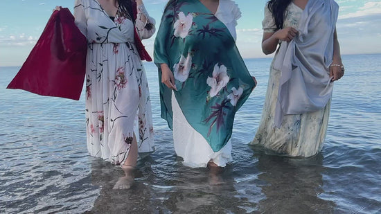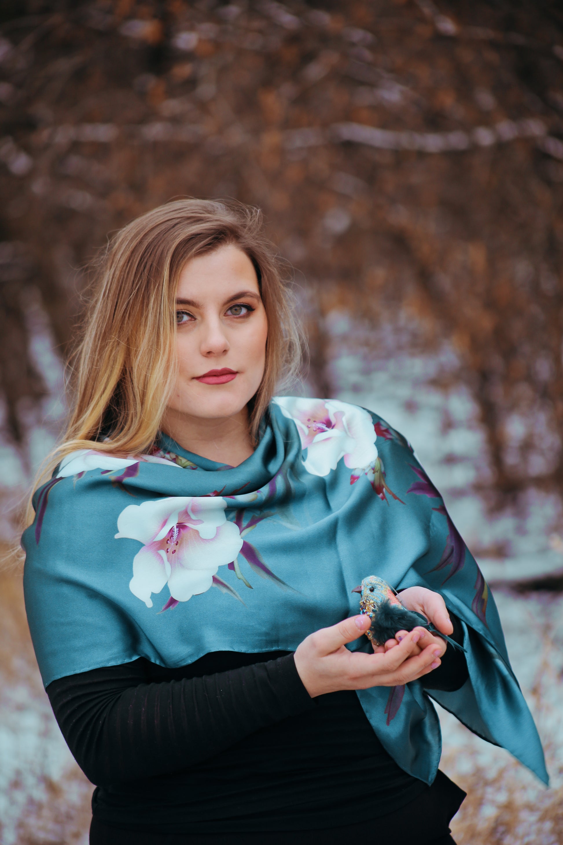 This vibrant silk scarf is inspired by the 'Green Honeycreeper' bird that is found in the tropical from Southern Mexico to Trinidad. This pure silk scarf is an eye catcher, it is such a beautiful piece that can be worn in any season for it is versatile look. This one is definitely a grab and one of our favorite.