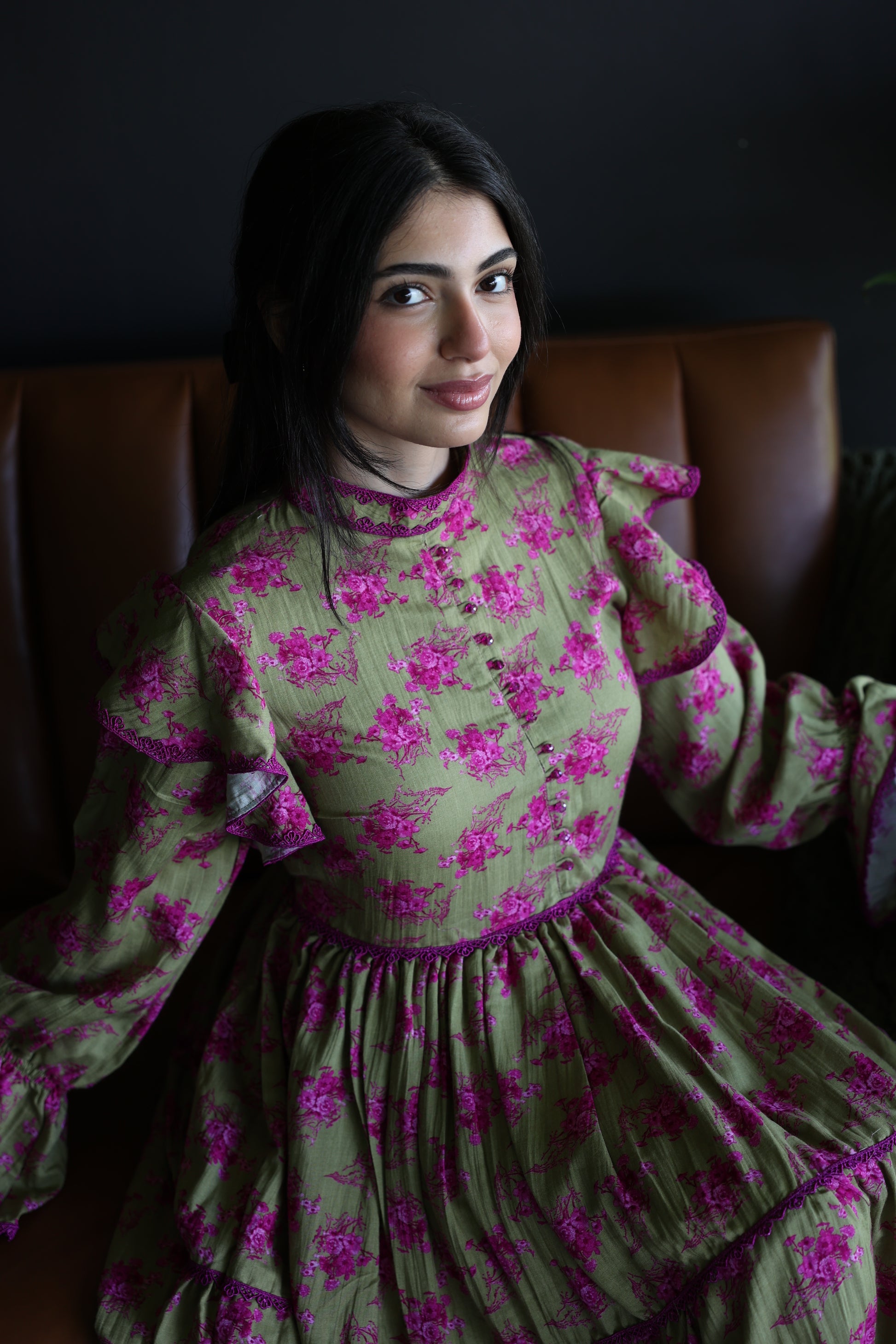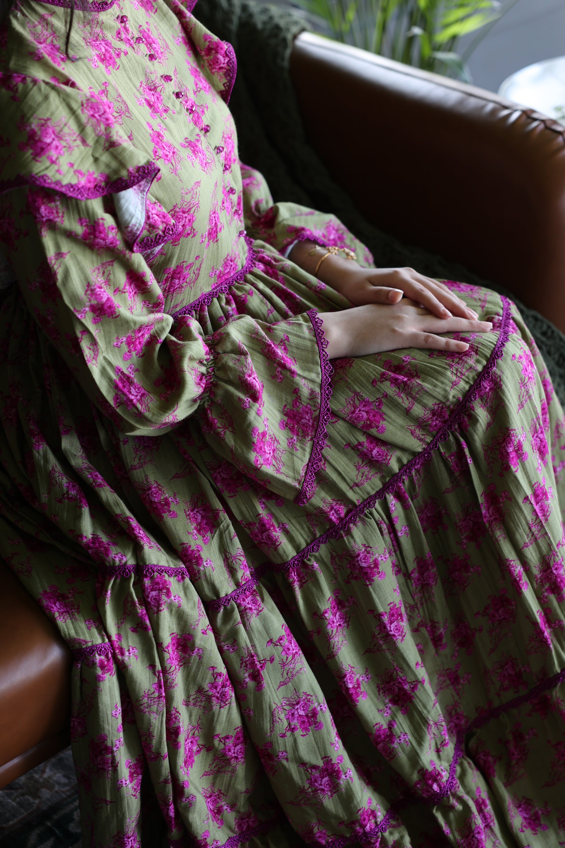 The Olive Rose Manor Dress is a romantic, vintage-inspired silhouette crafted from a textured floral fabric is soft olive tones with vibrant rose detailing. Designed with layered ruffle sleeves, a high Victorian-style neckline, and delicate lace edging, this dress brings together brings together the elegance and charm in a timeless way. The bodice features subtle pleating and dainty button accents, flowing into a beautifully tiered skirt that creates graceful movement with every step.