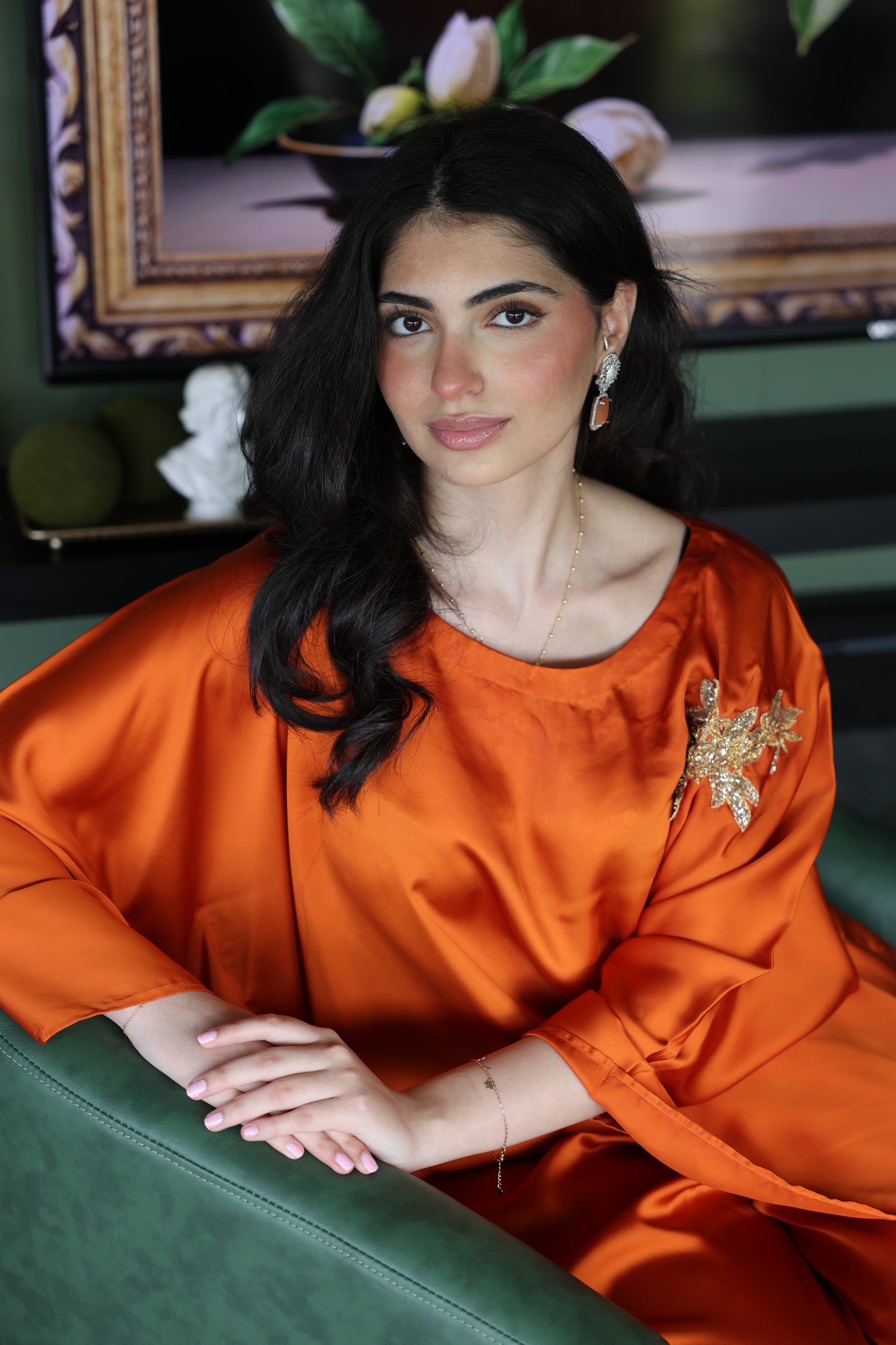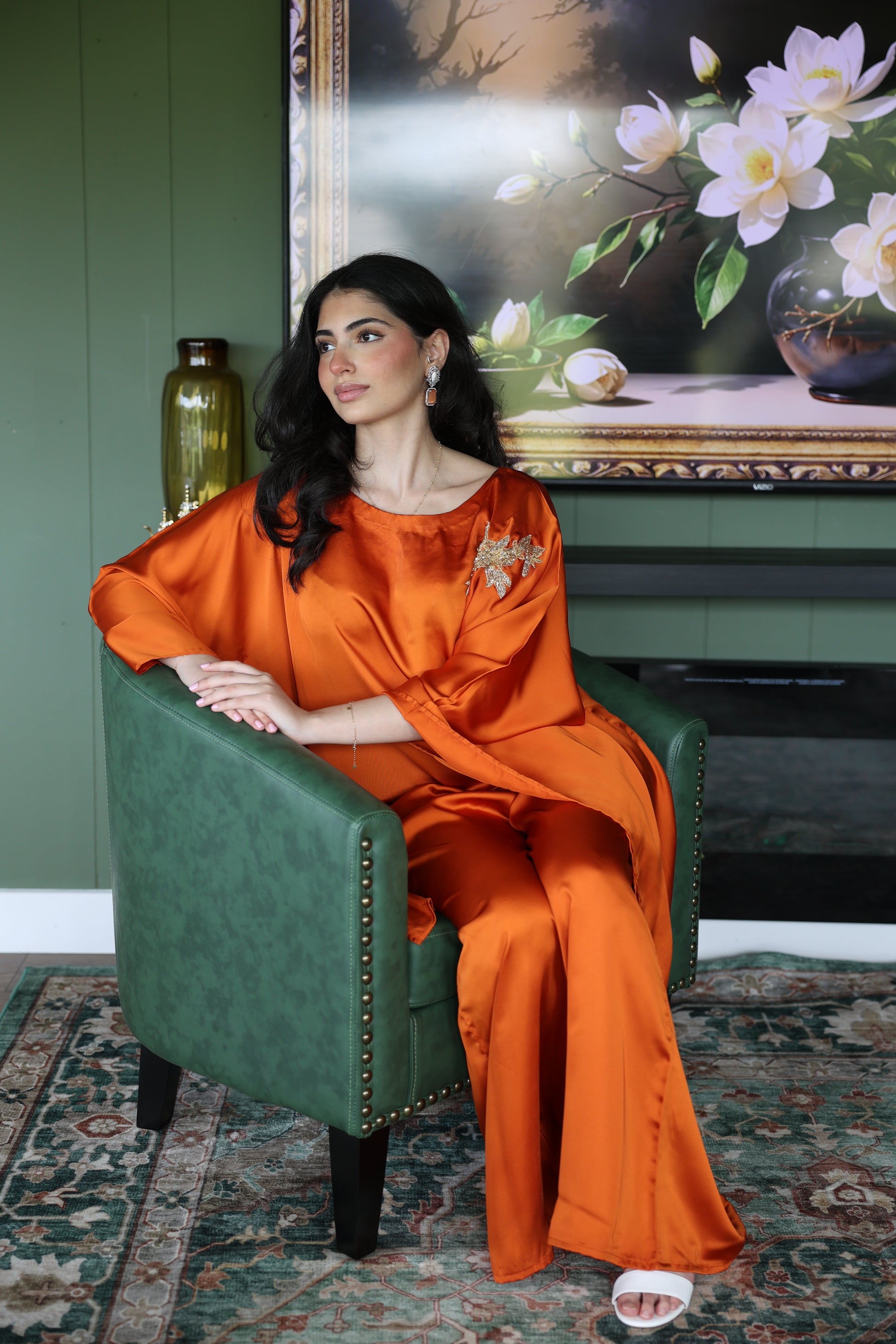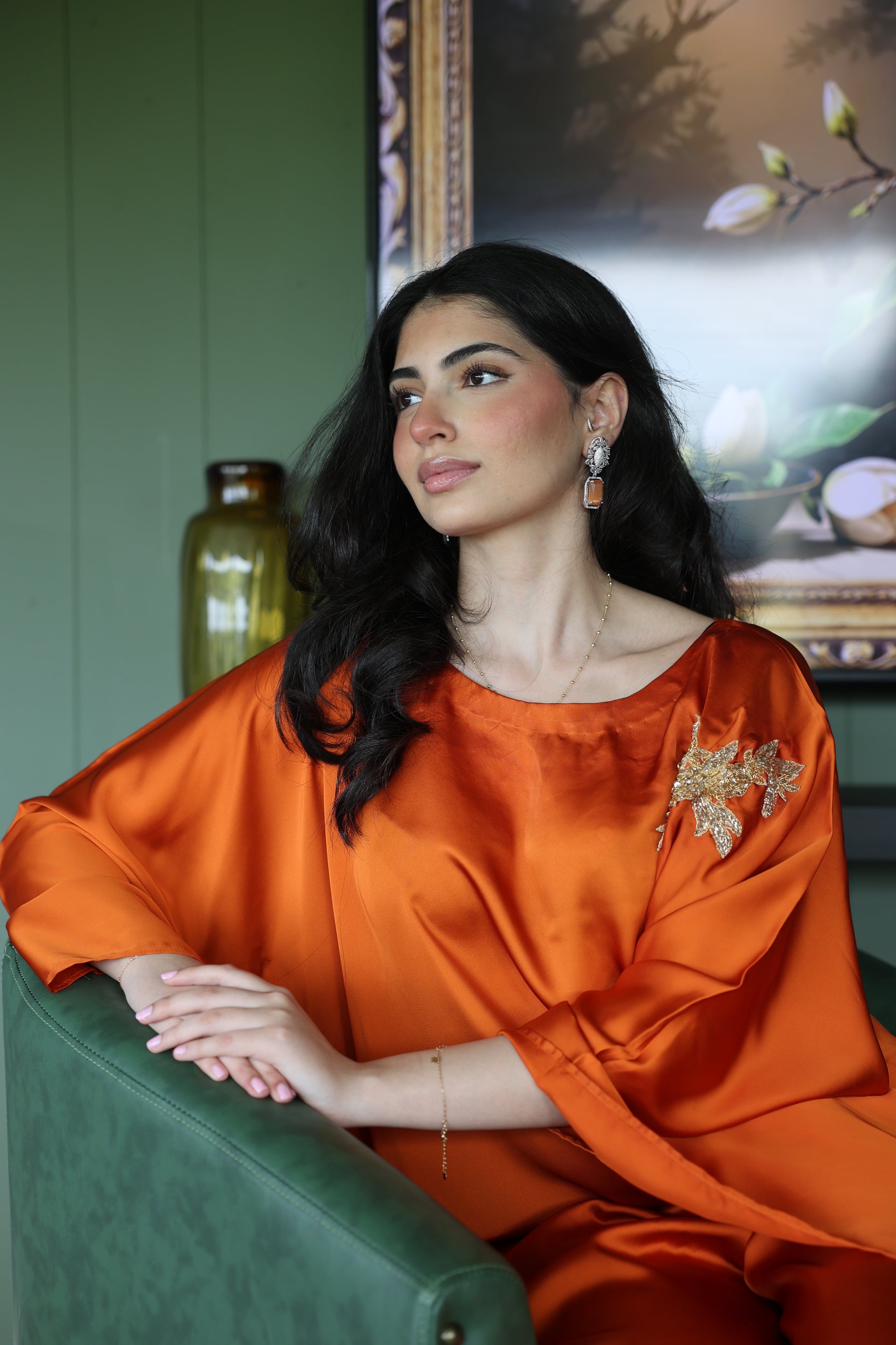 The Sunset Ember Kaftan Set is a striking two-piece set designed in a rich, luminous silk fabric that drapes beautifully with every movement. The top features a relaxed kaftan-style silhouette with softly cascading sides, offering fluidity and elegance while maintaining a modern, structured look. A statement crystal-embellished motif sits gracefully on one shoulder, adding just the right amount of sparkle without overwhelming the piece.