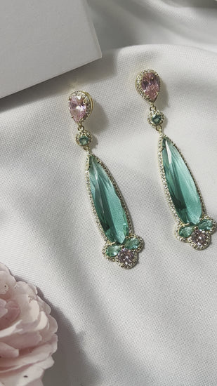 Zarhee Victorian style green and pink stone earrings that are beautifully hand-crafted with a border of crystal stones to give it additional detail. These earrings are designed to be unique and stand amongst the crowd. A beautiful contrast that is fun yet powerful to hold an entire look by itself.